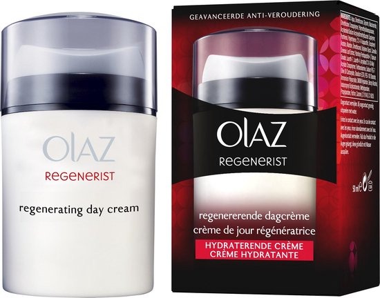 Olaz Regenerist Regenererende Dagcrème Maakt lijntjes en rimpels gladder voor een jonger uitziende huid. Vernieuwt de jeugdige look van de huid. Vermindert de zichtbaarheid van fijne lijntjes en rimpels. Exfolieert, egaliseert, zorgt voor een stralende huid. 1e gebruik: de huid wordt intens gehydrateerd en fijne lijntjes en rimpels zijn zichtbaar verzacht. Na verloop van tijd: er zijn zichtbaar minder fijne lijntjes en rimpels. Rijke, niet-vette formule met geavanceerd amino-peptidecomplex vernieuwt de oppervlaktelagen van de huid en onthult een nieuwere huid.