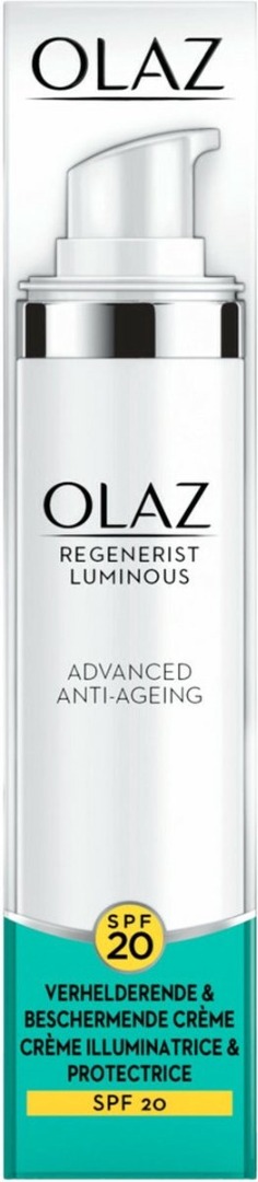 Olaz Regenerist Luminous Anti-Veroudering Verhelderende & Beschermende Dagcrème Met SPF20 is een anti-veroudering Dagcrème met de luxe geavanceerde Pearl Optics formule. Deze verhelderende formule met SPF dringt tot wel 10 lagen diep in het huidoppervlak door om een sprankelende huid te onthullen. Het vermindert na verloop van tijd donkere vlekken en verkleuringen.